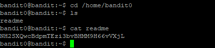 우리는 여기서 /home/bandit0가 홈 디렉터리임을 알 수 있고, cd /home/bandit0 를 통해 디렉터리로 접근하여 readme를 읽어보도록 하자!